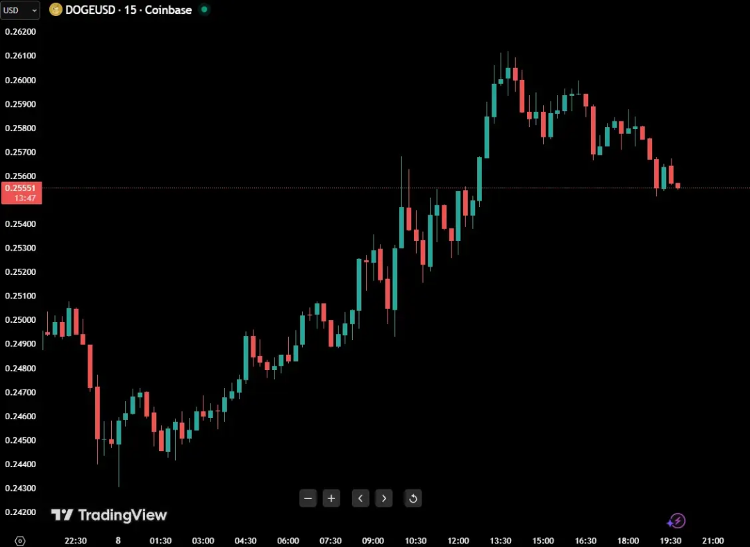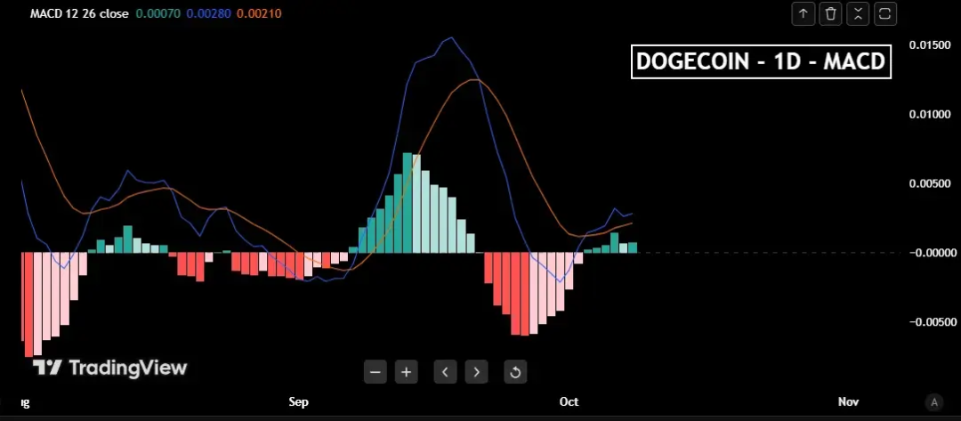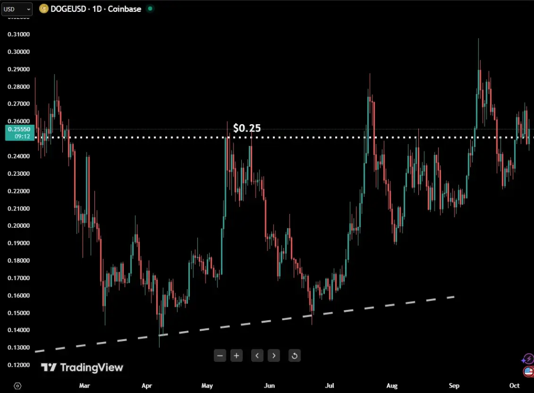 这波上涨主要受机构买入消息和投资者情绪提振的影响,DOGE 当天一度飙升超 5.45%(修正前)。目前 Dogecoin 的价格正处在 2025 年的关键中枢区间,如果后续节奏配合得好,它很有机会冲上 0.3 美元。