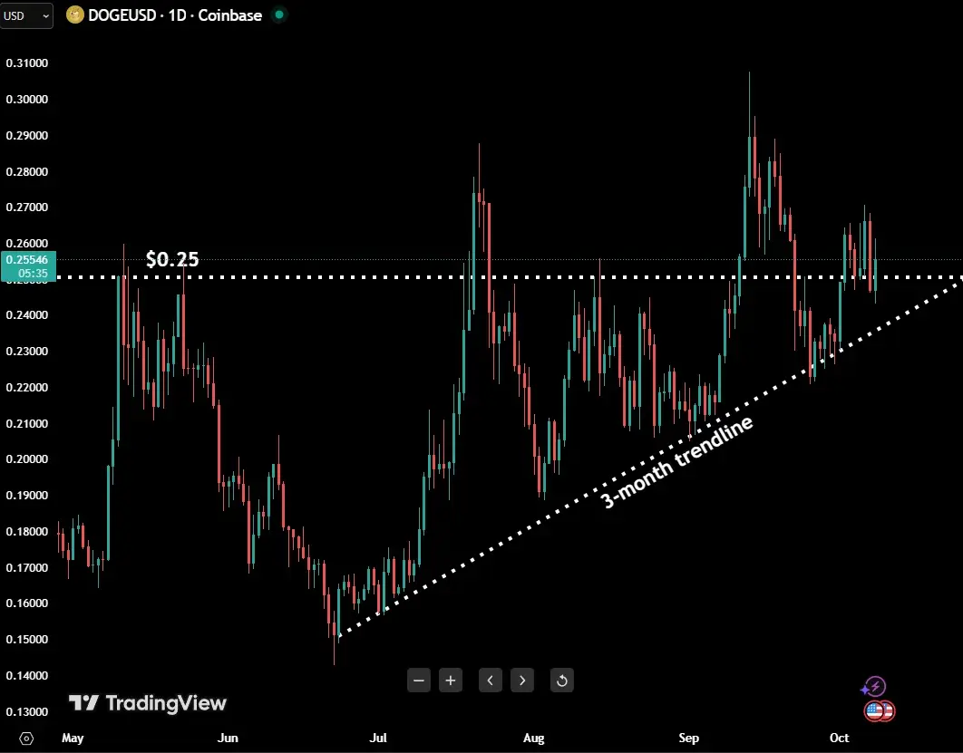 情况是这样,现在有几种走势形态都在暗示,Dogecoin 已经到了“成败在此一举”的关键时刻。当前价格正被挤压在上升趋势线(1天K线图的3个月趋势线)和顽固的0.25美元阻力之间,形成了一个标准的上升三角形形态。