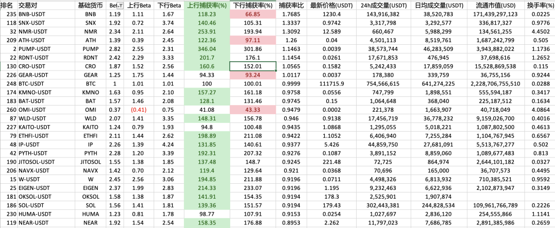 举例:BTC涨10%,某币涨15%,上行捕获率 = 150%