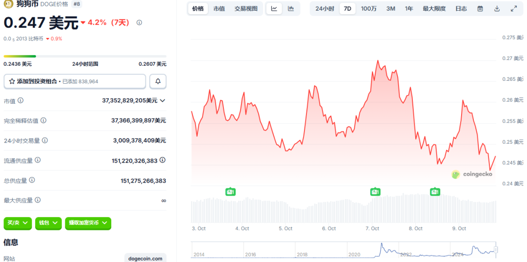 在刚刚过去的72小时里,狗狗币(DOGE)经历了一场惊心动魄的多空博弈。10月7日至9日,这只备受瞩目的meme加密货币在0.25美元关键心理价位附近展开激烈争夺,三日累计跌幅超过6%。尽管有第二只现货ETF获批的利好消息加持,DOGE仍未能扭转下跌趋势。当前,所有目光都集中在0.2444美元支撑位上,这个位置将决定DOGE四季度的走势方向。