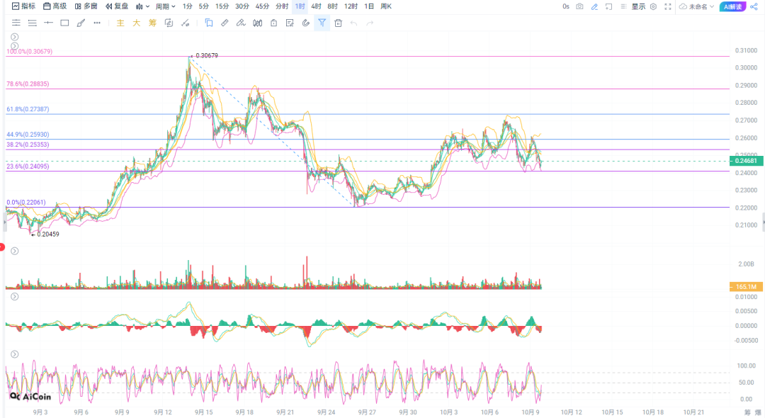 meme币的高波动特性在DOGE上体现得淋漓尽致。在四季度初这个关键时间点,保持谨慎乐观的态度,严格控制仓位,才是生存之道。随着交易时间的推移,DOGE多空双方在0.25美元附近的争夺已进入白热化。北京时间10月9日下午,DOGE报价0.25429美元,日内最低下探0.25326美元,跌幅0.53%。0.244美元支撑位成为后市走势的关键参考点。如果能守住这一位置,结合ETF的长期利好和可能到来的山寨币季节,DOGE在四季度仍有机会逆袭冲击0.48美元前高。如果跌破这一关键支撑,市场可能会下探0.1425美元下一个重要支撑位,跌幅可达40%。