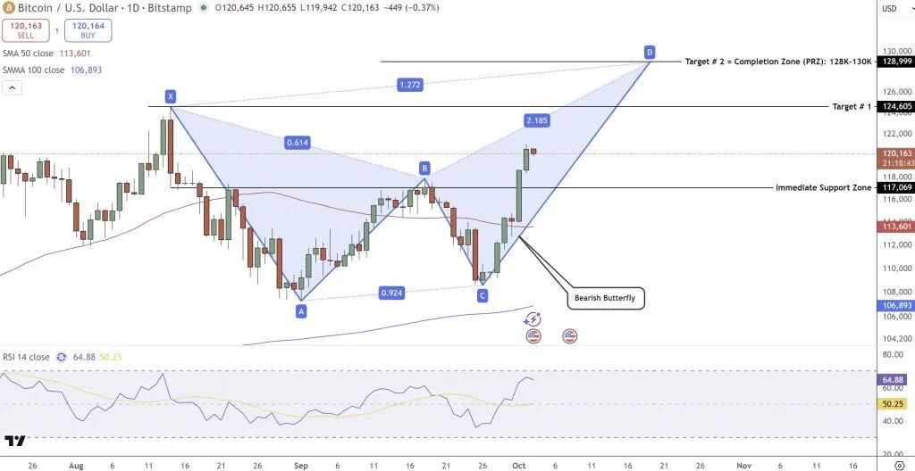 然而,从技术角度来看,谨慎仍然有必要。比特币当前的涨势正在形成看跌蝴蝶形态,潜在反转区域 (PRZ) 预计在 128,000 美元至 130,000 美元之间。尽管短期内势头依然看涨,但这种谐波结构警告称,更高水平可能存在抛售压力。