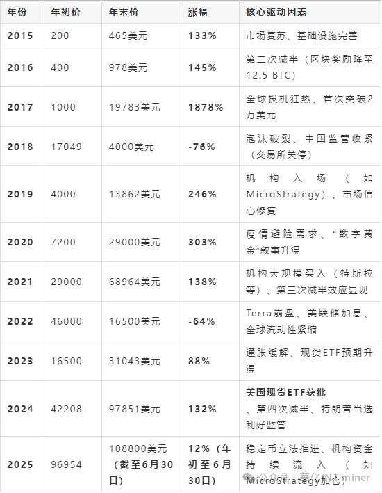 本部分为比特币近十年(2015-2025年)年度涨幅与关键驱动因素分析,综合历史数据及市场事件整理呈现: