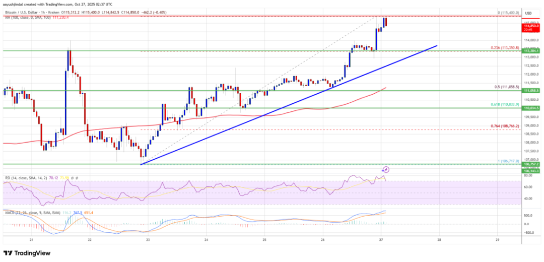 比特币此前一度跌破108,000美元,触及106,720美元低点,随后迅速反弹。目前已攻克112,000美元阻力,多头推动价格升破113,500美元和100小时SMA,最终突破115,000美元关口。