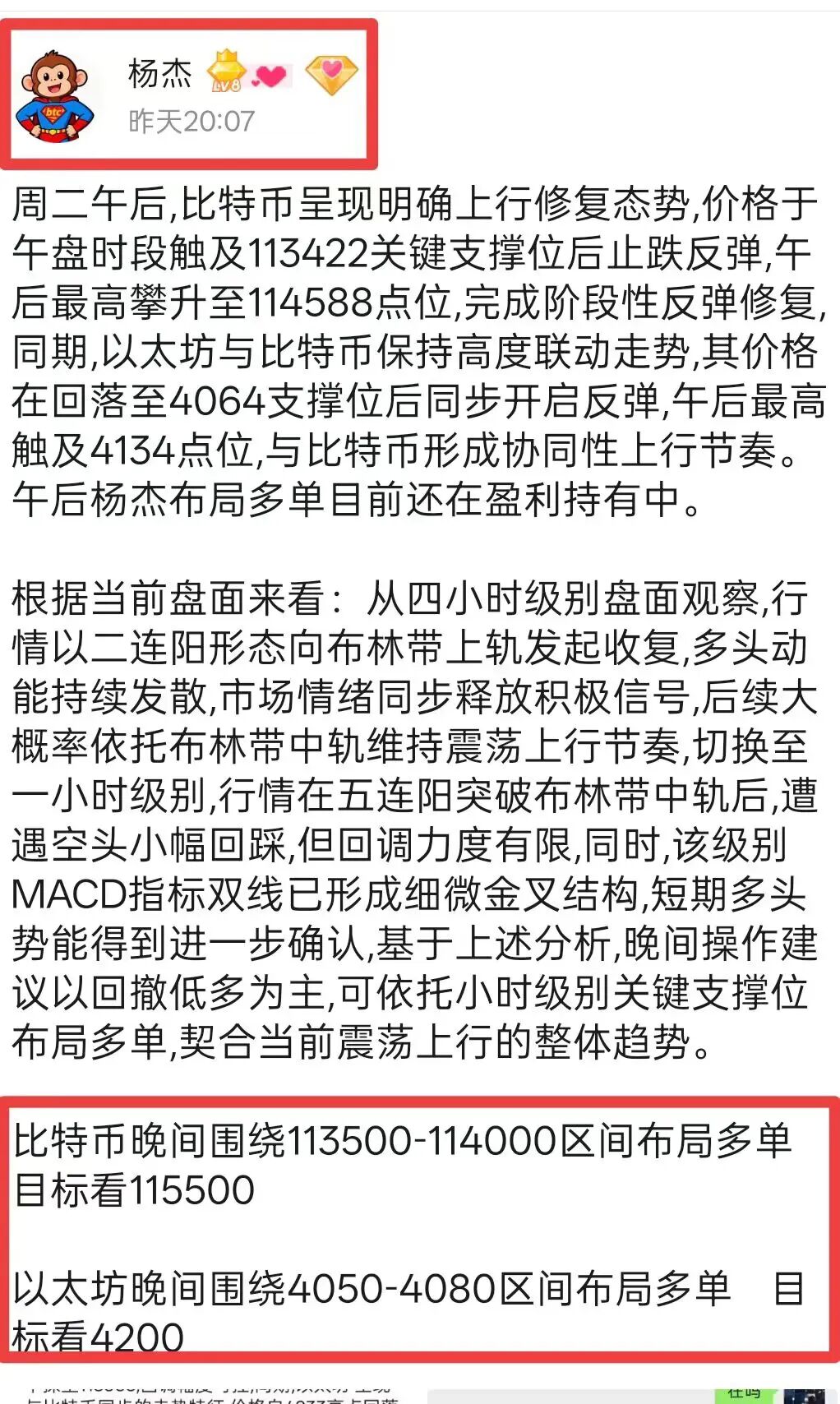 回顾周二日内比特币价格在早间114500高点一线后呈现震荡下行的态势,直至午后时分行情最低下探至113422低点一线后止跌,午后自低位开始出现强势拉升至晚间116070高位一线,以太坊日内行情同样是保持比特币走势,价格在早间4140高位一线后承压回落,直至午后时分价格最低下探到4064低点你先后止步反弹至晚间行情再次探高至4174高点一线,日内杨杰布局四单,早间布局以太坊空单在4127进场在4065离场以太坊空单斩获62点空间,其次午后再次布局比特币和以太坊多单,比特币两单分别在114205和114361进场,在115233和115390离场,比特币共计斩获2060点空间,以太坊多单在4117进场在4169离场以太坊多单拿下52点空间