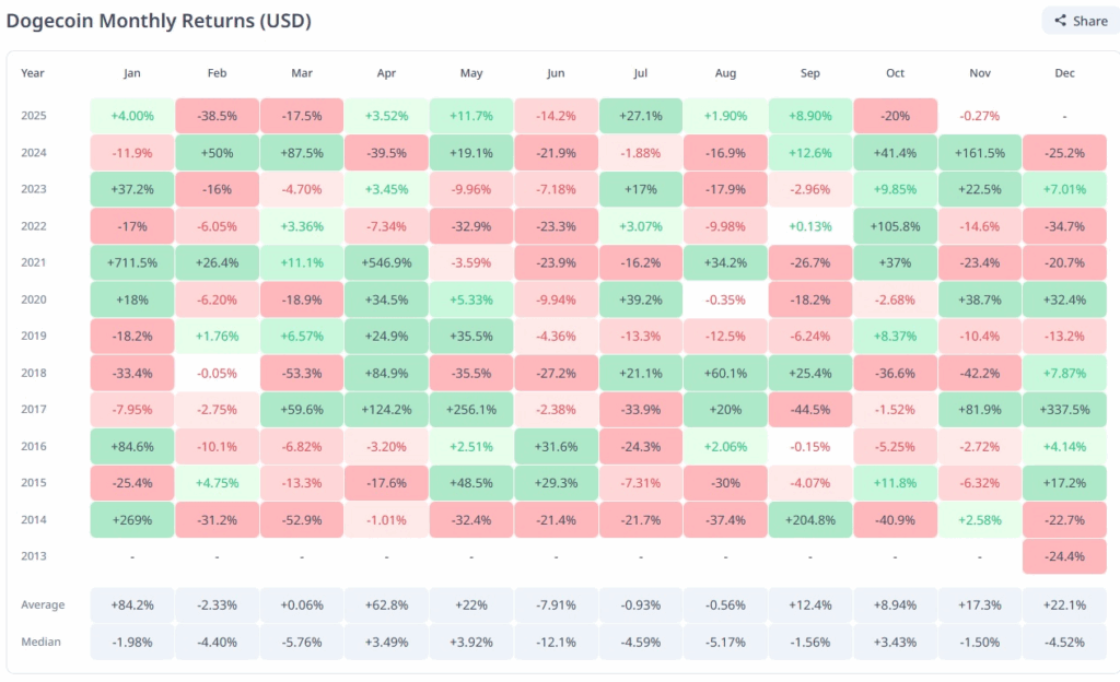 虽然狗狗币波动性一向很高,但历史数据显示,它在 11 月的表现喜忧参半——过去五年里,有三年在 11 月都实现了上涨。