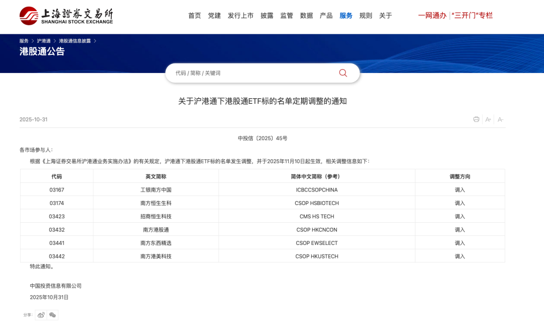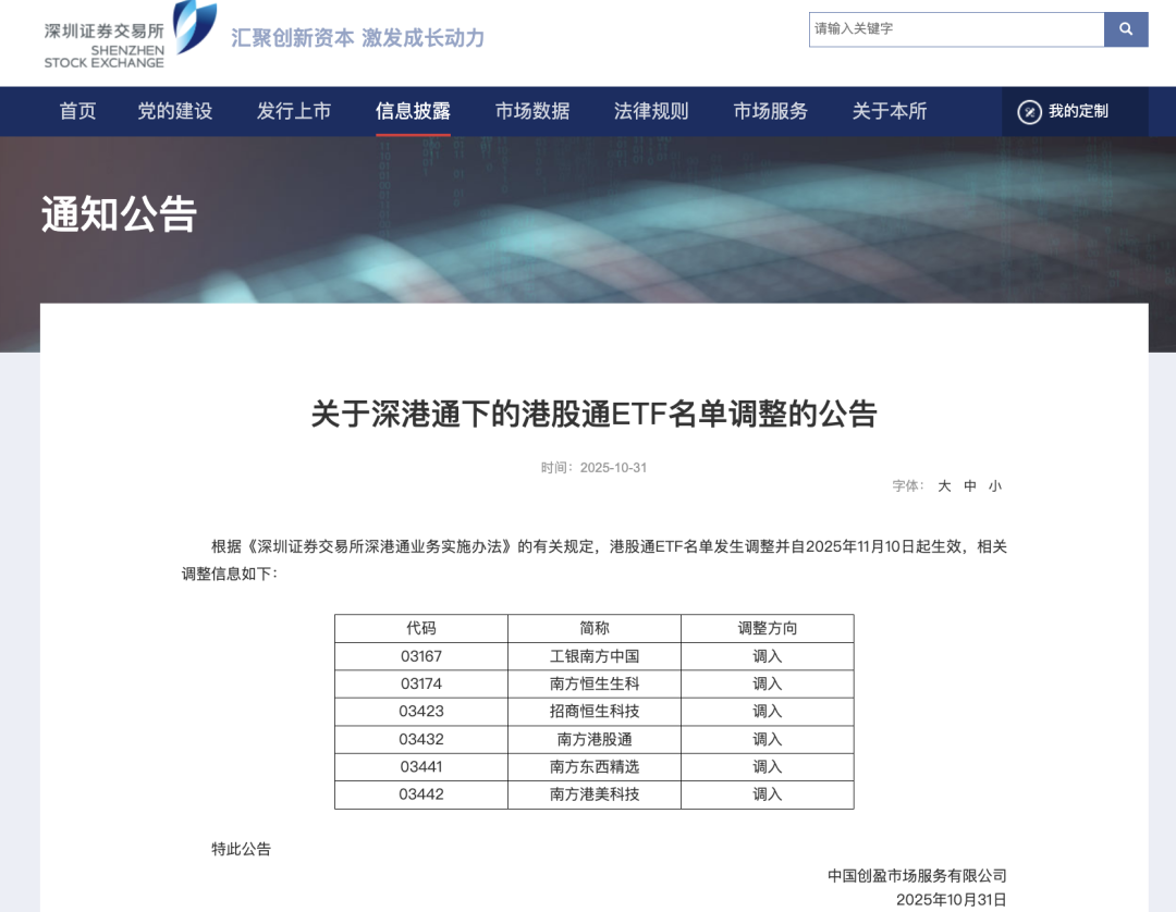 10月31日,记者从沪深交易所官网获悉,“南向ETF通”最新扩容名单出炉。根据《上海证券交易所沪港通业务实施办法》《深圳证券交易所深港通业务实施办法》的有关规定,港股通ETF标的名单发生调整,并于2025年11月10日起生效。