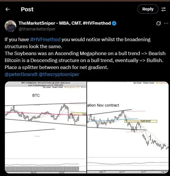 一位主要的形态专家弗朗西斯·亨特 (Francis Hunt) 指出,扩音器的方向有所不同。他表示,大豆形态是上升扩音器,而比特币形态是下降结构。与布兰特不同,他认为 BTC 形态是看涨的。