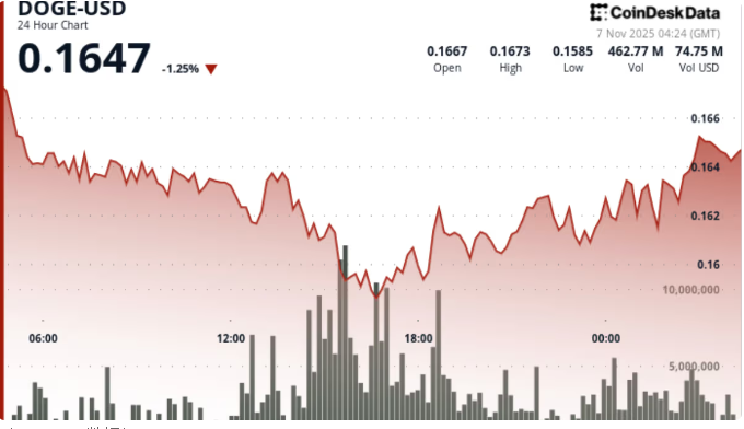 狗狗币(DOGE)在24小时内下跌2.4%至0.1634美元,跌破0.167美元的支撑位,抛售潮加剧。该代币日内波动幅度达6.4%,在前16个交易小时内连续创出更低的高点。