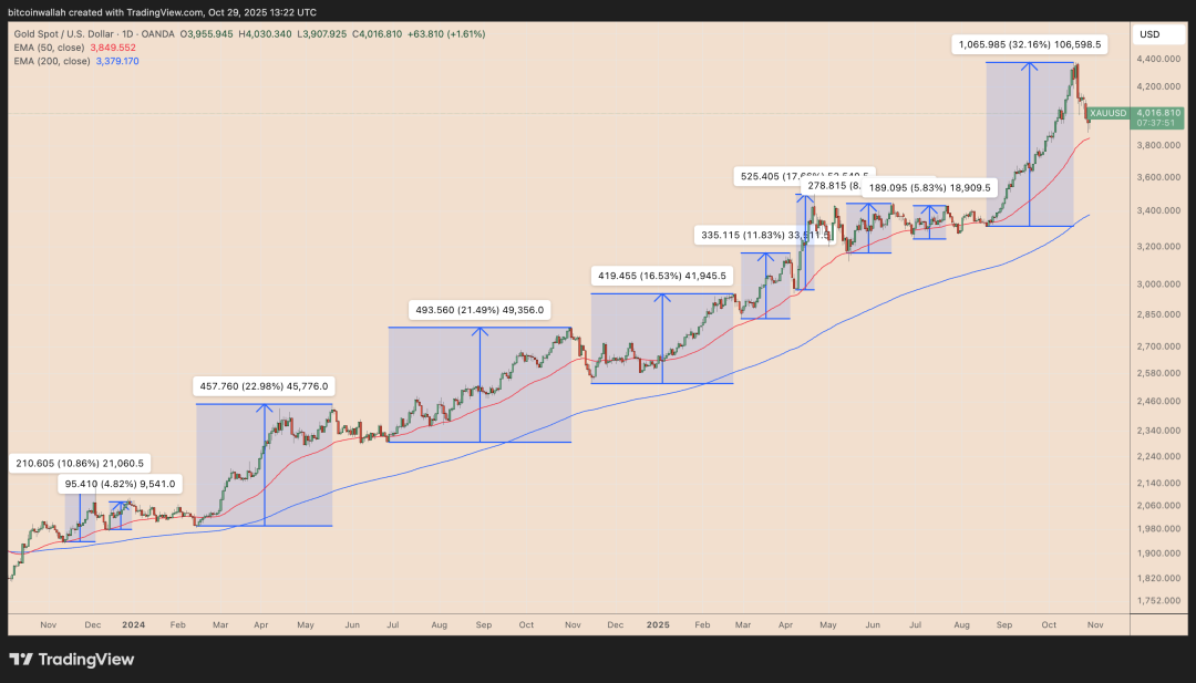 随着风险偏好改善和加密货币市场升温,黄金价格回调至 4000 美元支撑位以下,是否预示着交易员将在未来几个月内重新转向比特币?