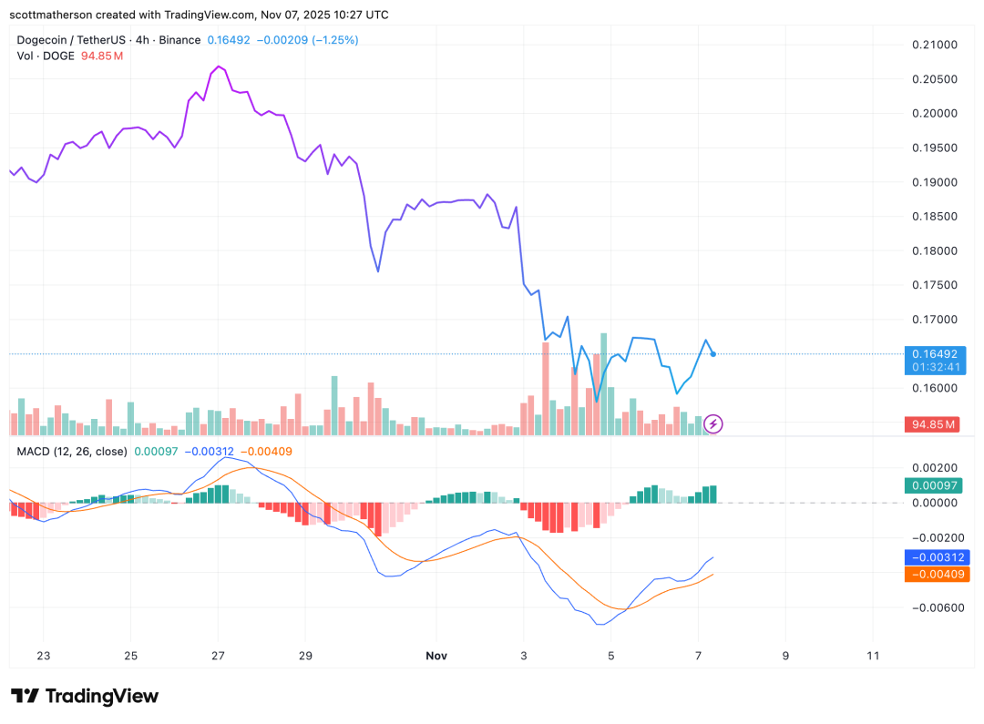 过去一周,狗狗币的价格在0.15美元至0.17美元之间震荡,延续了10月份的疲软走势。尽管整体加密市场表现不佳,但技术分析显示,狗狗币在支撑区域附近保持了稳定,成功抵御了下跌压力,稳固地守住了0.15美元以上。