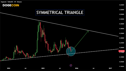 根据NekoZ的分析,狗狗币目前正处于一个持续数月的对称三角形形态内。该形态在周线图上清晰可见,形成时间追溯到2024年末。周线图显示,价格正接近该形态的下边界,反转的可能性很高。10月份狗狗币价格创出新高,表明它可能迎来爆发式的上涨或下跌。考虑到当前形态已经守住了0.15美元的支撑,该形态更倾向于看涨突破。