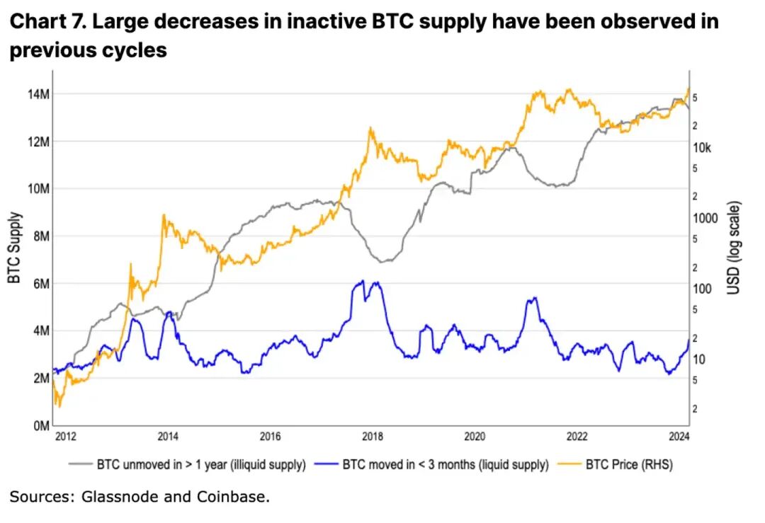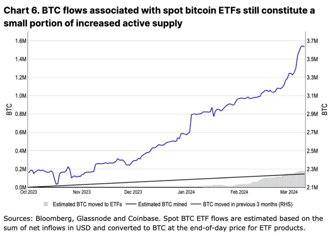 事实上,虽然新比特币供应限制是一个重要的考量因素,但它也只是诸多因素中的一种。自 2020 年初以来,可供交易的比特币(即流通和非流动性供应之间的差值)一直在下降,这与之前的周期相比发生了重大变化。但最近的数据表明,自 23 年第四季度初以来,活跃的 BTC 供应量(在过去 3 个月内发生过转移的比特币)大幅增加了 130 万,而在此期间新开采出来的比特币仅为约 15 万。尽管市场比过去更有能力吸收这种供应,但我们仍然认为,谨慎的做法是不要过度简化这些市场动态之间的,复杂的相互作用。