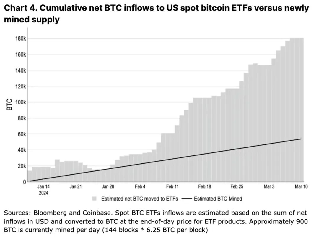 这个周期确实可能会有所不同。美国现货比特币 ETF 的持续每日净流入会继续成为该资产类别的巨大东风。由于新开采的比特币供应量即将减半,这将导致市场动态更加紧缩。
