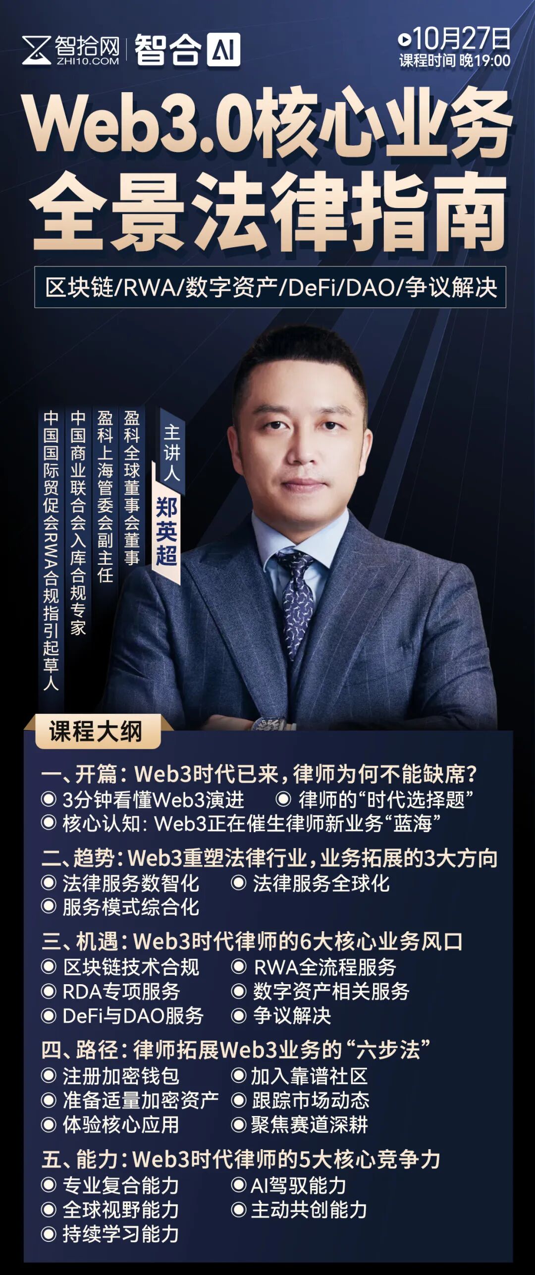 10月27日19:00,盈科全球董事会董事、盈科上海管委会副主任郑英超律师将在智拾网带来“Web3.0核心业务全景法律指南”