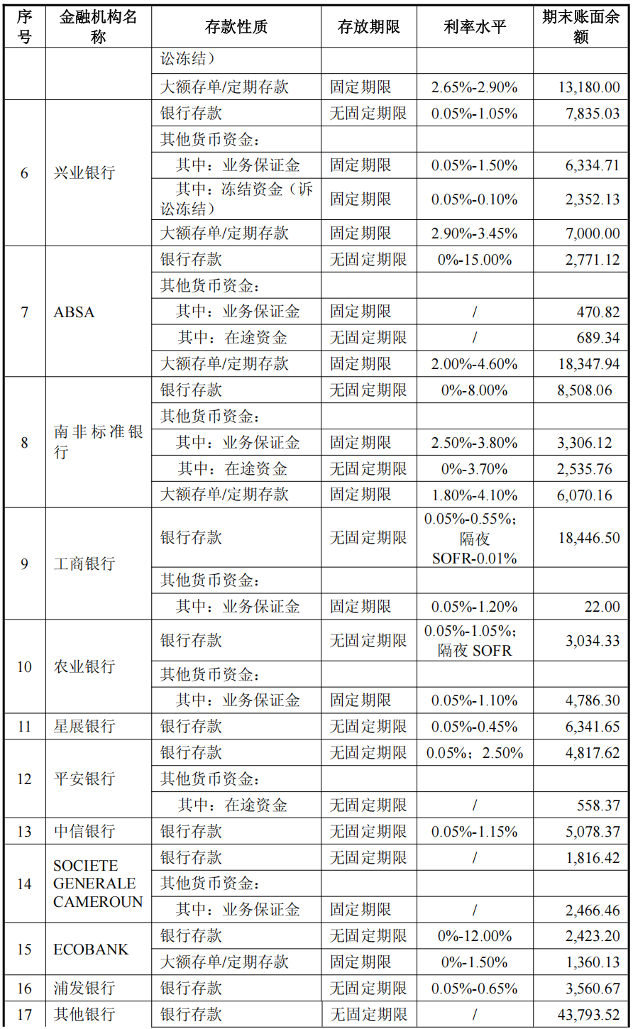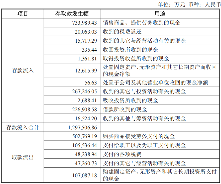 2、日均存款余额、单日最高金额、存取款发生额及相应用途公司日均存款余额为303,545.10万元,单日最高金额为345,555.53万元(鉴于公司月度货币资金余额可在一定程度上体现当月公司货币资金水平,综合考虑公司境内外银行账户数量、信息化水平,该处以月均余额近似测算日均余额、单日最高金额,下同)。
