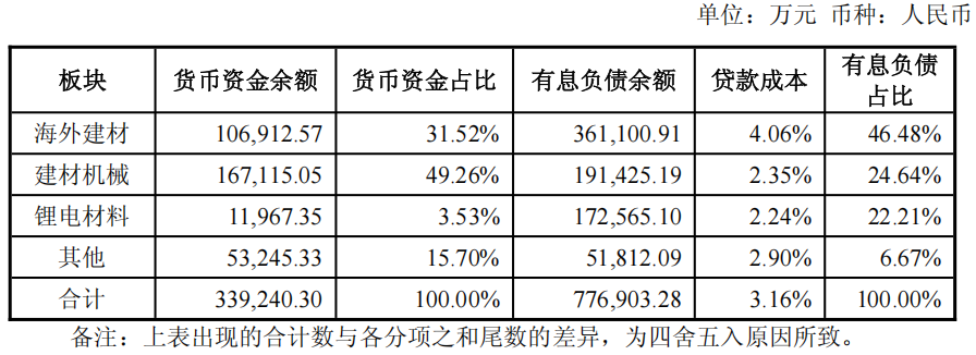 公司有息负债主要分布于海外建材、建材机械、锂电材料三大业务板块,合计占有息负债总额的93.33%,且以中长期贷款为主;货币资金则主要集中在海外建材和建材机械板块,合计占比为80.78%。海外建材板块和锂电材料板块的企业均为公司非全资子公司,公司对非全资子公司总体融资管理模式为:各子公司原则上应独立解决自身日常经营的融资需求,公司可提供增信支持。