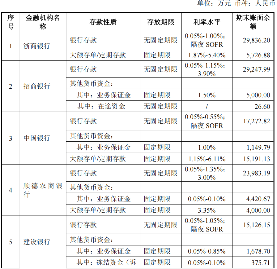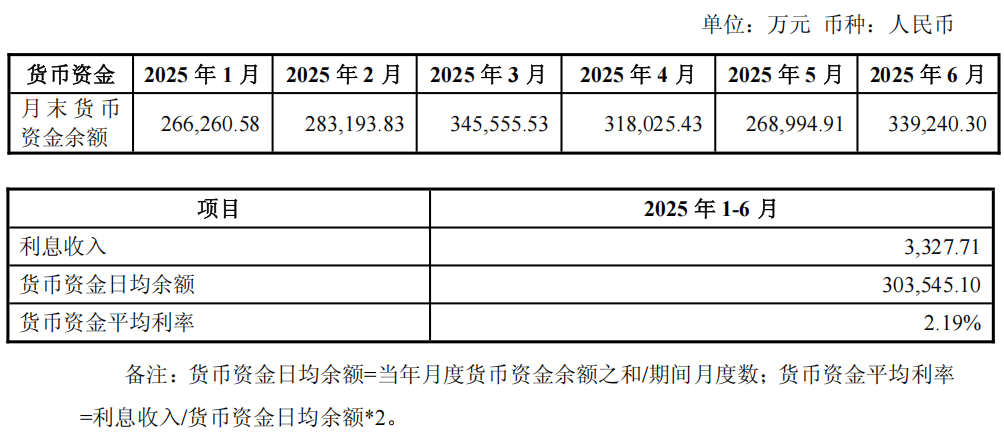 2025年上半年,公司整体银行协定存款利率为0.35%-1.35%,三年期大额存单利率为2.65%-3.45%,美元存款利率为2.30%-4.30%左右。公司在货币资金管理中,始终将安全性与流动性作为首要目标。在保障日常运营资金需求的基础上,将闲置资金主要配置于协定存款、大额存单等高效益存款类产品,以此提升资金效益,实现流动性与盈利性的统一。因此,公司货币资金平均余额与利息收入相匹配。
