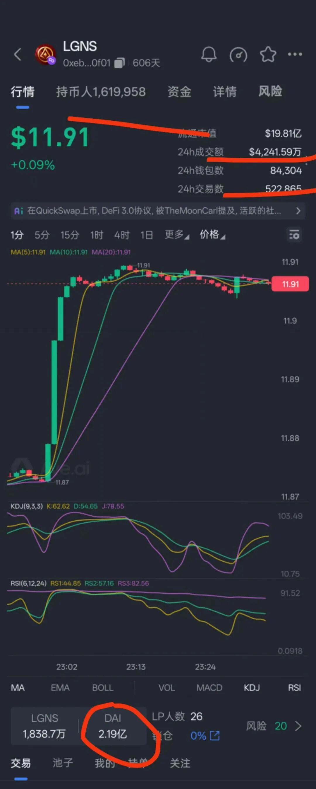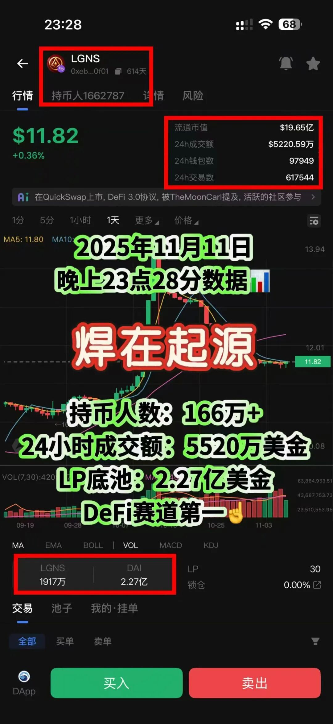 – 生态期:隐私稳定币A横空出世!销毁LGNS就能铸稳定币,还能买债券套利,持币地址破120万,底池直接冲2亿美金,我就是这时候跟风上车的。