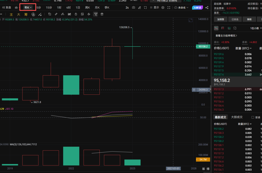 周线收了一个光脚阴线,上周跌幅8.86%下跌9184美金,从开盘的103715.38到收盘的94531.3美金,本周继续高空思路不变,年K上已经是一个十字星的状态,抹掉今年全部涨幅