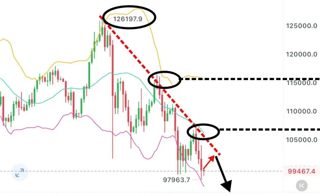 我们的核心布局逻辑始终是:依托反弹契机布局空单。至于近期的支撑底部,萧十一郎暂看9.6万附近,这一位置恰好对应日线级别BOLL指标的下轨区域,具备较强参考意义。