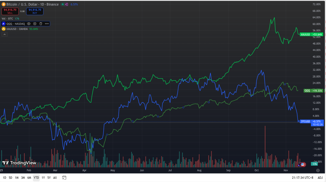 今年10月底起,黄金+比特币+美股齐跌——BTC全年涨幅直接归零: