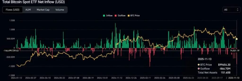 比特币ETF遭受重创。仅11月13日一天,随着比特币价格跌至9.5万美元附近,就有近10亿美元的资金流出。大型机构投资者显然感到恐慌。