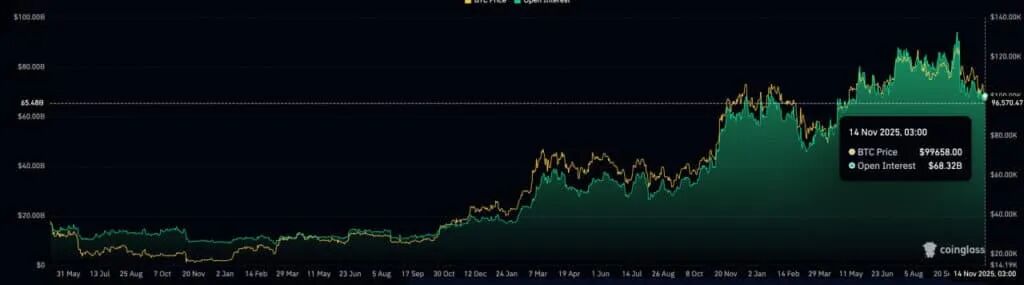关键在于:比特币价格难以维持在 10 万美元以上,而期货未平仓合约却高达 680 亿美元。这无疑会引发混乱,大量杠杆交易涌入市场,加剧整个市场的波动性。尽管市场低迷,交易员们依然坚守仓位,使得衍生品市场持续活跃。