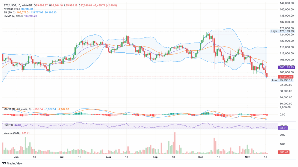 比特币目前的走势图看起来相当糟糕。BTC价格为97,240美元,下跌2.49%,刚刚跌破10.3万美元附近的关键支撑位,该位置原本是7日均线的支撑位。它甚至跌破了布林带下轨,这通常意味着比特币已经超卖,下行势头强劲。