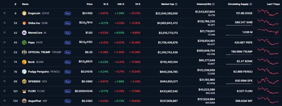 如今,市值最高的几种网络迷因币占据了加密货币市场相当大的份额。狗狗币市值达 220 亿美元,柴犬币 (SHIB)市值达 46 亿美元,MemeCore (M) 市值达 20 亿美元,Pepe (PEPE)市值达 17.5 亿美元。