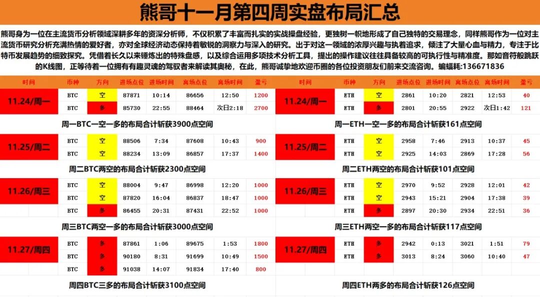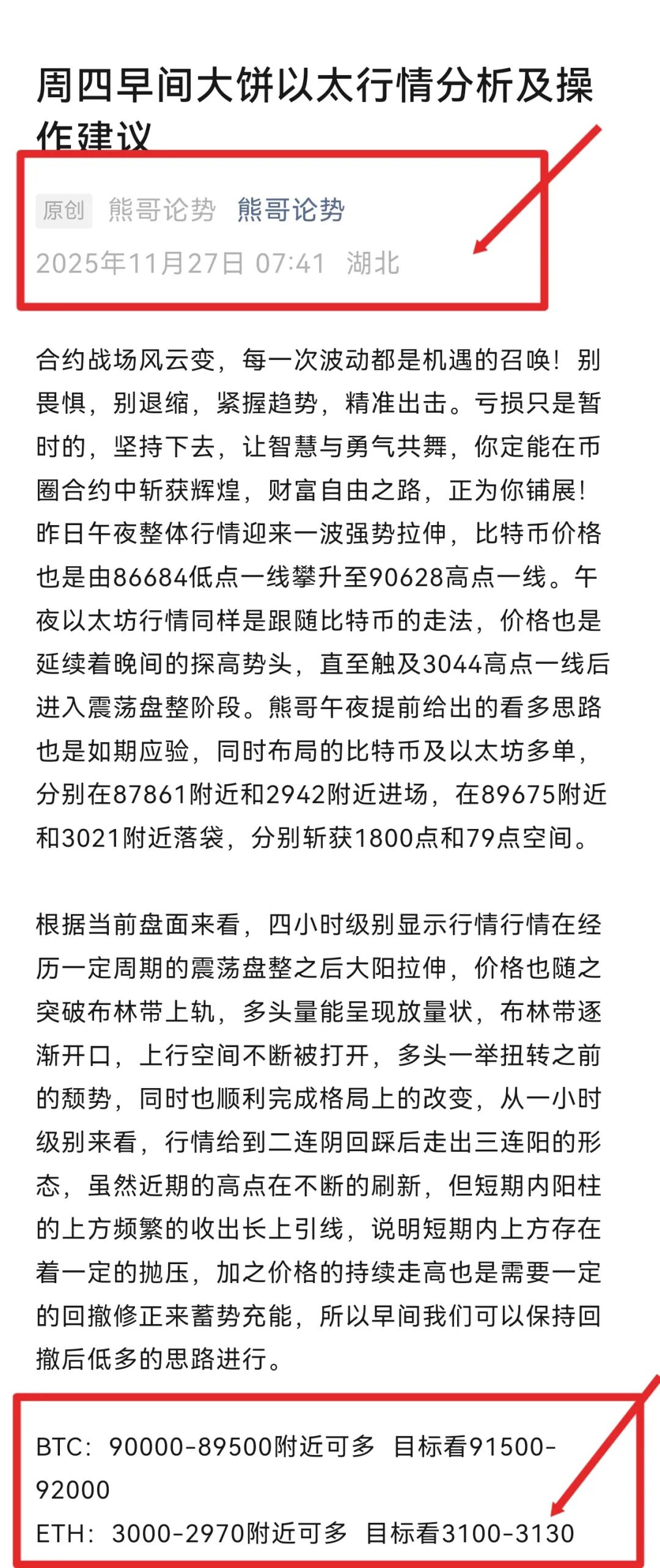 行情波动的不止是K线,更是梦想的脉搏。在这里,勇气与智慧共舞,贪婪与恐惧交织,每一秒都可能铸就传奇,每一刻都暗藏逆袭的曙光。周四日内整体行情呈现出窄幅震荡的走法,比特币价格自早间90024低点一线震荡式上探至午后时分的91931高点一线后承压,直至晚间行情最低回落至90410低点一线后止步,目前价格再次回暖至91351高点一线。以太坊日内行情同样是从早间的3002低点一线攀升至3070高点一线后承压回落,价格在一路震荡式走跌至晚间时分的2983低点一线,随即止步反弹,目前已经回暖至3024高点一线。熊哥日内分别进行比特币三多和以太坊两多的布局,均收下不错的利润空间,比特币三多合计拿下3100点空间,以太坊两多合计拿下126点空间。