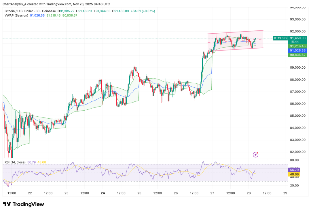 当现货资金流出减少、吸筹加速时,价格通常会开始构筑底部。这种动态在短期结构中有所体现。比特币在30分钟图上收窄在一个上升通道内,成交量加权平均价格(VWAP)在91,026美元的支撑位持续有效。日内K线图上一系列更高的低点显示出价格企稳的早期迹象。