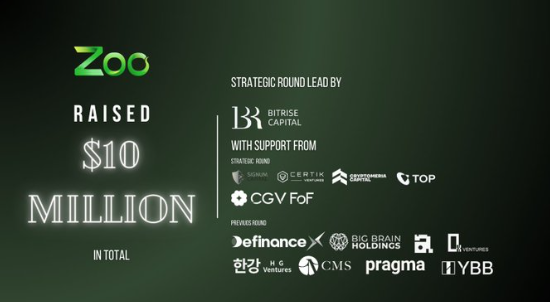 本轮战略融资由 Bitrise Capital 领投,Signum Capital、Certik Ventures、TOP、CGV Funds 和 Cryptomeria 参投。至此 Zoo Finance 融资总额达1000万美元,此前投资方包括 CMS Holdings、Big Brain Holdings、DefinanceX、Pragma Ventures、HG Ventures、YBB Capital、0xVentures 和 Aquarius Financials。