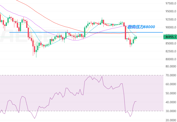 昨日晚间,BTC延续白盘弱势,从86300美元附近持续下跌至83788美元低位后获得支撑,当前已反弹修复至86500美元上方,与市场普遍关注的支撑位基本吻合。日线级别呈现明确空头趋势,K线从布林带上轨90900美元一路跌至下轨82000美元,MACD、KDJ等核心指标均维持空头排列,形成的“画门”形态几乎抹去前期十余天的全部涨幅。 值得注意的是,早间反弹后RSI指标已脱离超卖区域,回升至30-50区间,表明短期卖压得到集中释放,价格下跌的速度和力度明显减缓。但这并不意味着趋势由空转多,仅说明市场从“单边抛售”进入“震荡修复”阶段。真正的趋势反转需等待价格强势突破88000美元关键阻力位确认,该位置也是多空力量博弈的核心分水岭。 日内来看,短线压力聚焦87500美元一线,该位置对应四小时MA10均线,是短期反弹的重要压制;下方支撑则关注84000美元整数关口,同时82000-80000美元区间为周线和日线级别的强支撑带,主力吸筹概率较高,具备较高的做多性价比。