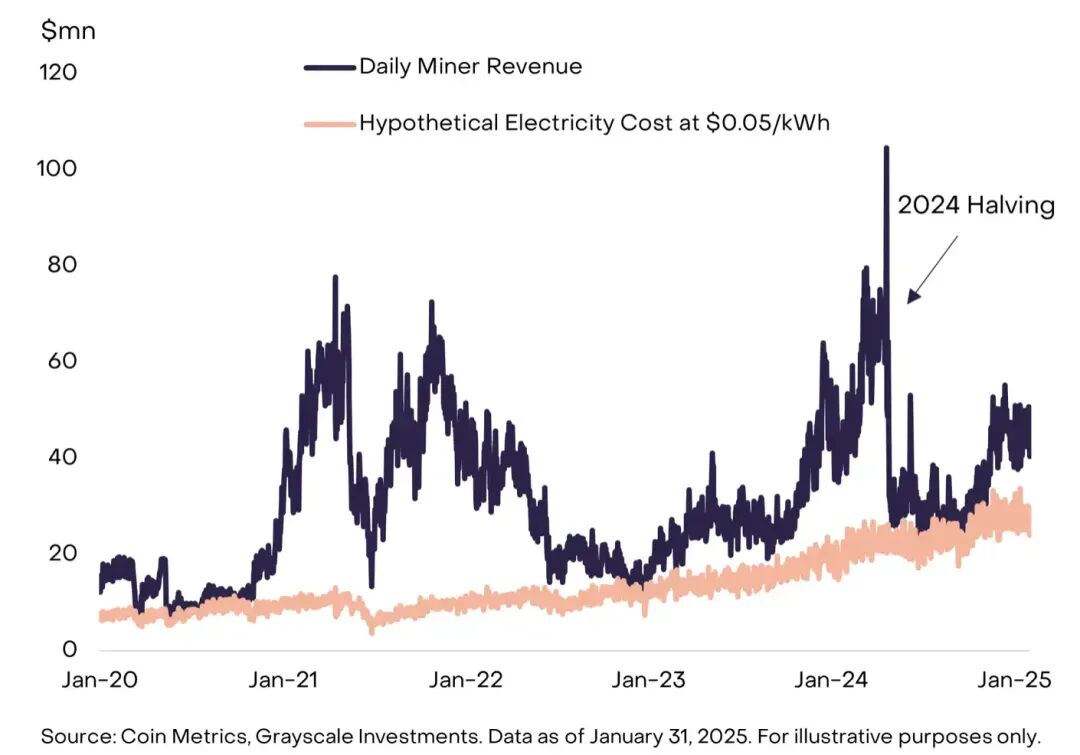 矿工们承担的运营费用,主要形式是运行机器所消耗的电力。每个运营者都会协商自己的电力购买协议,而这些协议在世界各地差异很大。为了便于说明,我们可以通过假设一个电费成本,并忽略其他成本,来构建一个简化的比特币矿工总体经济状况图。例如,图 3 将比特币矿工的收入与假设电价为每千瓦时 0.05 美元时的总电力成本估算值进行了比较。收入与电力成本之间的差额可以被视为矿工运营利润率的一个简化衡量指标。当区块奖励的美元价值增加时,矿工受益;而当生成哈希值的美元成本上升时,矿工则会受到损害。
