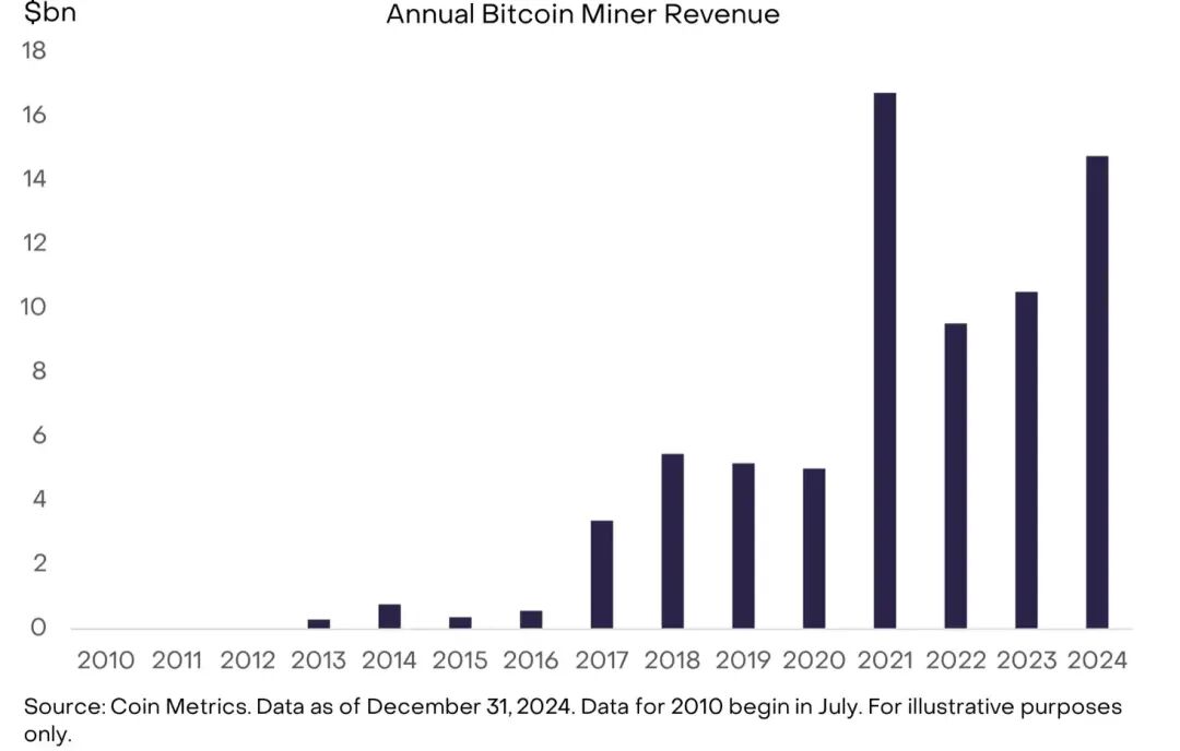 2024 年,矿工们总共获得了约 23 万枚比特币,按当时价格计算价值近 150 亿美元。与 2014 年相比增长了约 19 倍,复合年化增长率为 34%(见图 2)。每四年,新发行比特币的速率会在一个被称为「比特币减半」的事件中下降。尽管以比特币数量计算,发行量有所下降,但由于比特币以美元计价的价格上涨,挖矿收入随时间推移仍有所增加。未来,挖矿收入的增长可能来自比特币价格上涨和网络交易费用的增长。