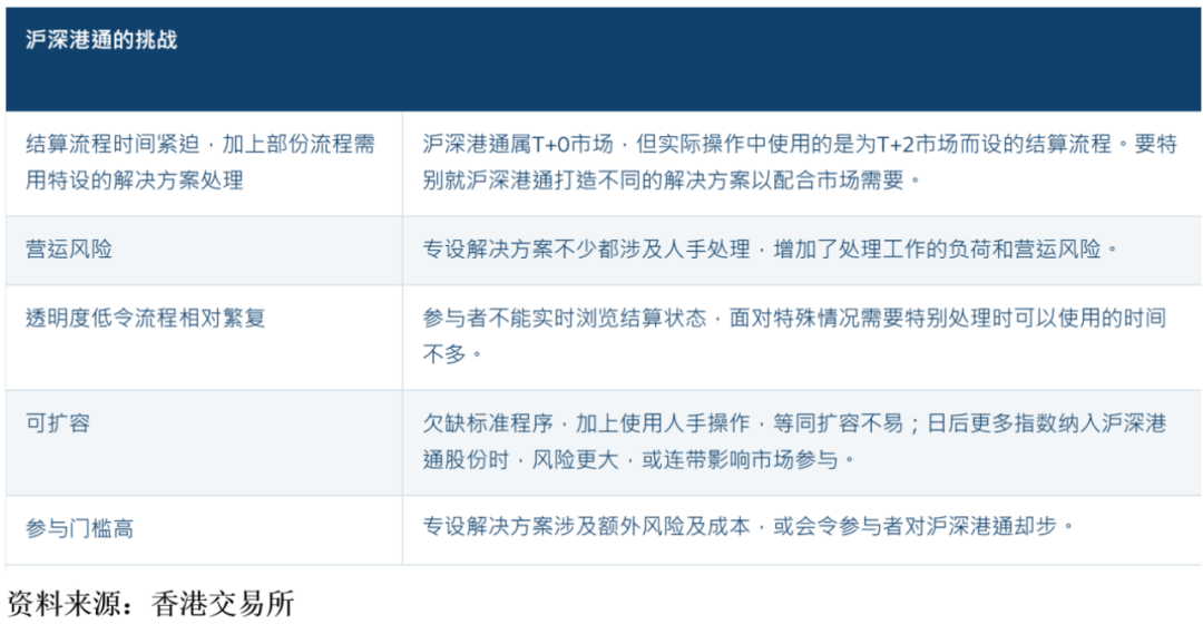 第一,沪深港通属T+0市场,但实际操作中使用的是为T+2市场而设的结算流程。要特别就沪深港通打造不同的解决方案以配合市场需要。