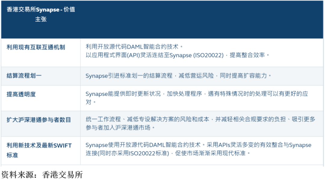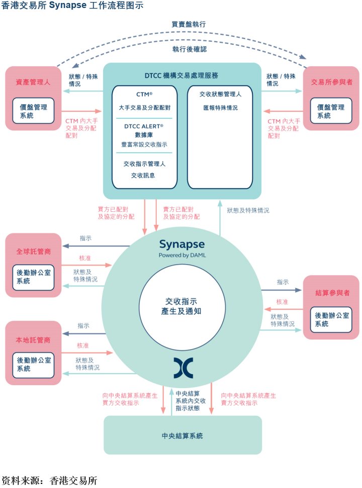 据香港交易所介绍,Synapse是为沪股通和深股通参与者提供的服务选项,作用犹如划一规范的中央平台,作为交收指示工作流程的单一数据源,透过DTCC(美国证券存管结算公司)的中央配对解决方案 “CTM®”作出的“常设交收指示”,再加以丰富交易资料。接着,系统随即向整个交收链的各方发出交收指示,利便不同环节的工作同步进行,提高沪深港通市场参与者的效率和透明度,同时亦让他们进行交易后的工作流程更流畅。
