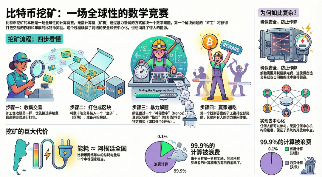 你一定听说过”比特币挖矿”,但你知道矿工们到底在干什么吗?他们真的在”挖矿”吗?那些耗电惊人的矿机,24小时不停运转,究竟在计算什么?