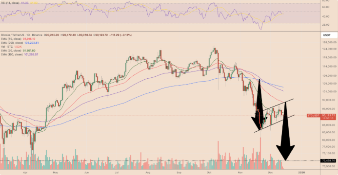 比特币,作为最初的加密货币,曾在心理压力下停留在9万美元。该价格比今年最高点低约29%,表明仍处于深度熊市。