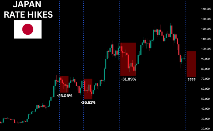 第三,历史显示当日本央行加息时,比特币价格会下跌两位数。最严重的降级发生在去年,当时该银行数十年来首次加息。