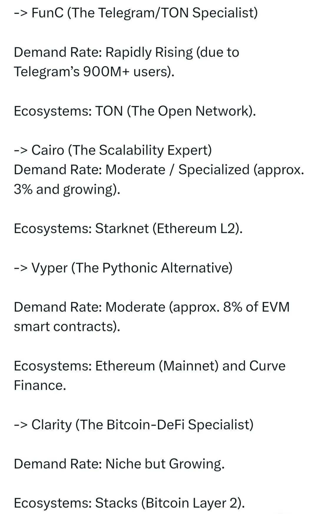 * FunC (社交链专家):Telegram 背后 TON 链的专属语言,主打高并发和异步处理,专门用来承载数亿用户的社交与支付需求。