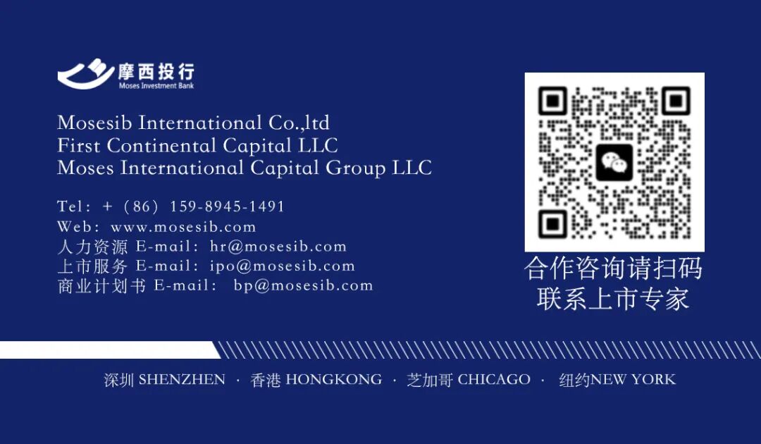 摩西投行是成立于2015年的中美港三地的国际领先精品投行。致力于美国资本市场上市持续融资服务。倾力打造垂直细分领域第一股。专注于NASDAQ、NYSE上市及OTC挂牌辅导、出海并购、企业资本化发展中顶层设计、战略及运营、股权、商业模式、架构重组、估值、合规、投融资等专业服务。