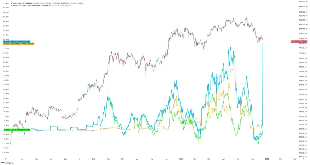 比特币价格(截至撰稿时86,314 美元)较 126,200 美元的峰值下跌了 30%,目前在 85,000 美元支撑位上方交易,引发了人们对其可能进一步回调至 70,000 美元区域的担忧。尽管如此,链上数据显示,机构和高净值人士仍在增持比特币。