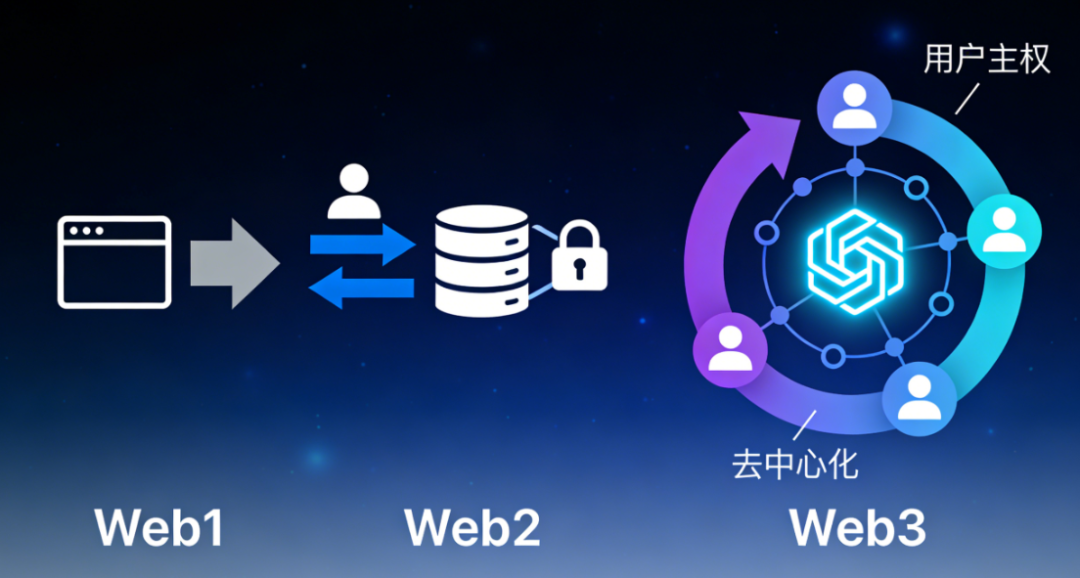 从 Web1 到 Web3,本质是 “权力从平台向用户转移” 的过程,三者的核心差异清晰呈现为互联网的三次关键迭代:
