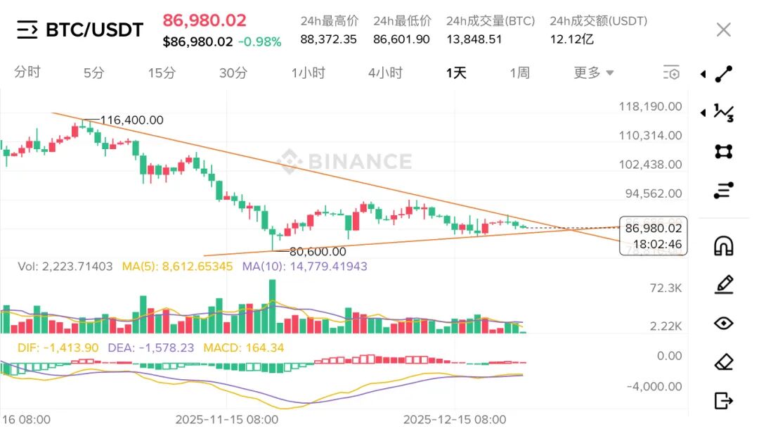 比特币最近一直处于一个84000-90000附近的震荡,而且比特币昨天测试了一下日线级别的下跌趋势,没有突破,现在开始继续震荡下跌,群里也提示了,这里比特币大概率会去测试85000附近,所以提示做空