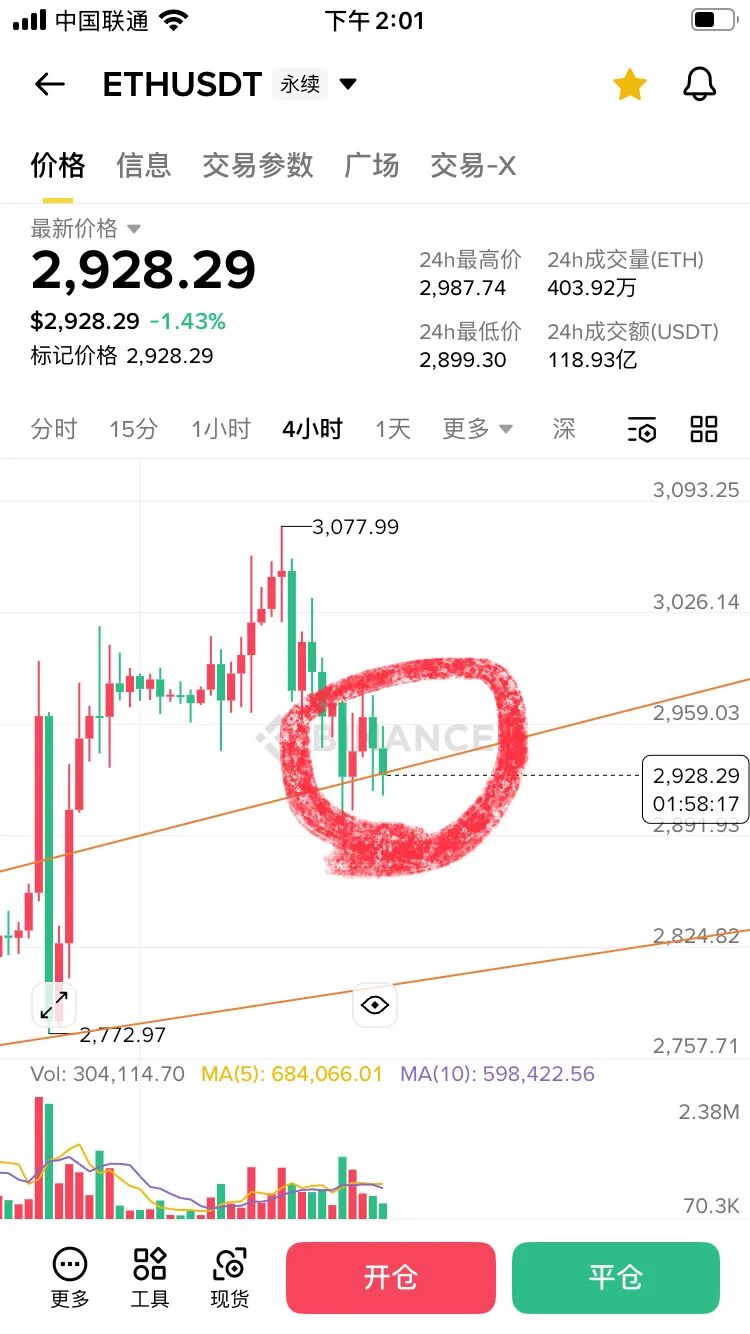 以太坊目前同样的逻辑,这里熊市就是这样,比特币和以太坊行情的差别没有那么明显,以太坊这里4小时如果有效跌破2920附近,大概率会去测试2800这里,所以关注这里的下破情况,来进行日内短线的交易