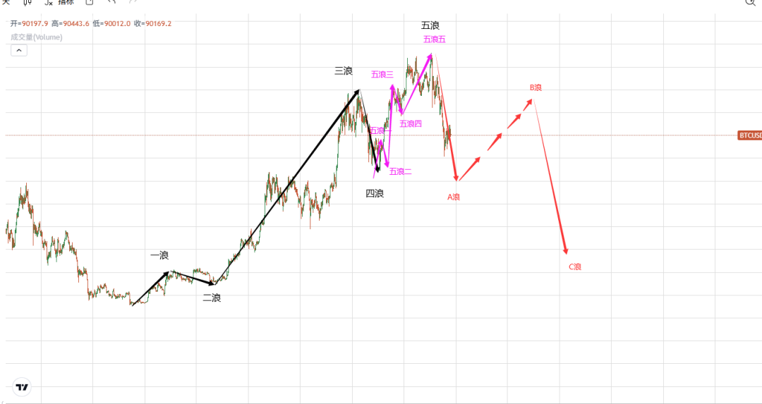 第一步先走A浪,A浪的目标是回到第五浪的起点位置7.5W;