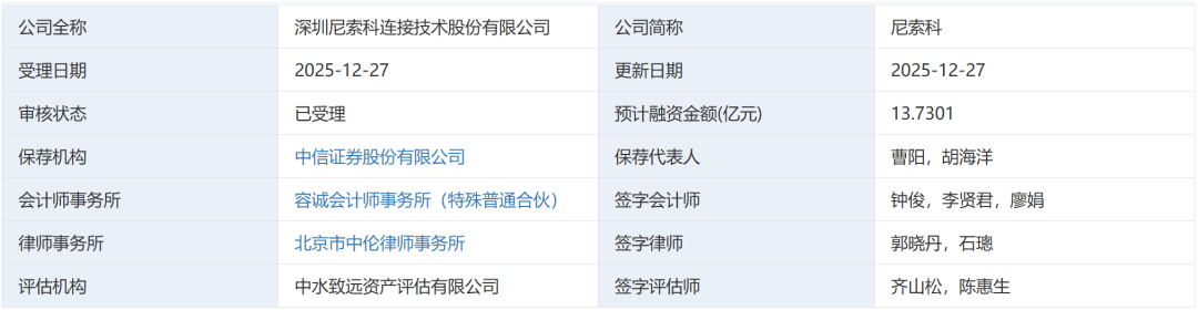 公司长期专注于高压大电流场景下的连接系统接触件产品。经过多年研发及创新,公司现有接触件产品涵盖转簧、扭簧、触点夹簧等系列产品。同时,公司已推出卷制接触件、浮动接触件、推拉快锁组件、复合材料接触件等新一代产品,在新能源汽车、储能、通信及AI数据中心等各类高压大电流应用场景下为各类头部客户提供接触件解决方案。保荐机构中信证券,会所容诚,律所中伦。