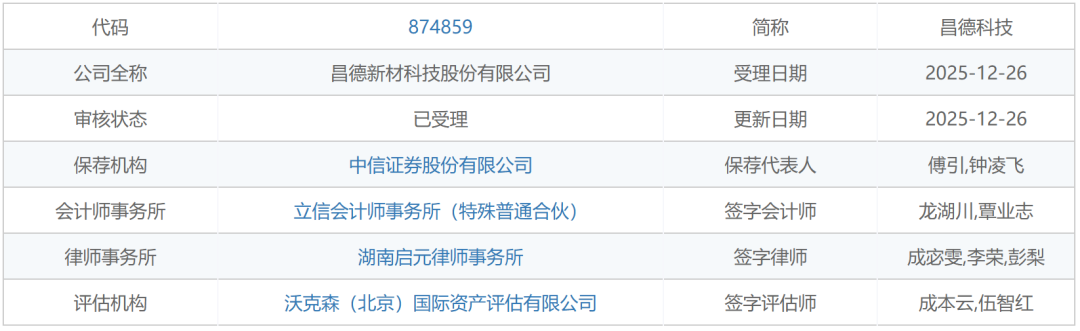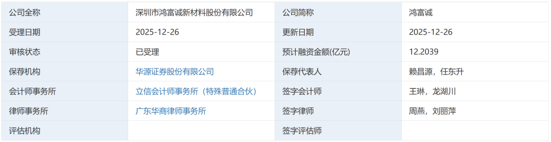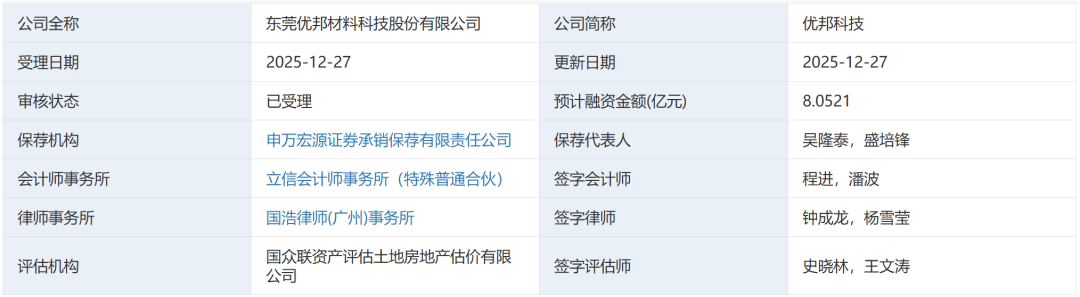公司是一家专注热管理、电磁屏蔽和吸波等先进电子功能材料及器件研发、产业化的国家级专精特新重点“小巨人”企业,产品广泛应用于数据中心(AI高功率芯片、光模块)、智能汽车、5G 通信及消费电子等领域。保荐机构华源证券,会所立信,律所广东华商。
